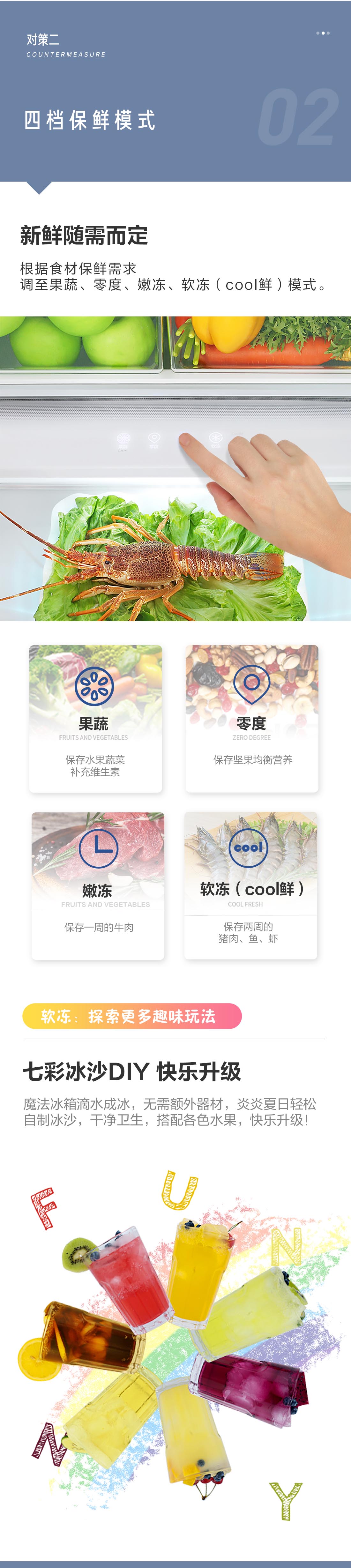 搭載-5℃瞬凍黑科技,鮮嫩兩星期,輕松一刀切。細胞級養鮮,營養流失少。搭載-3℃嫩凍黑科技,食材不結冰,鮮嫩一整周。智能全變頻技術,恒溫保鮮,節能靜音。
