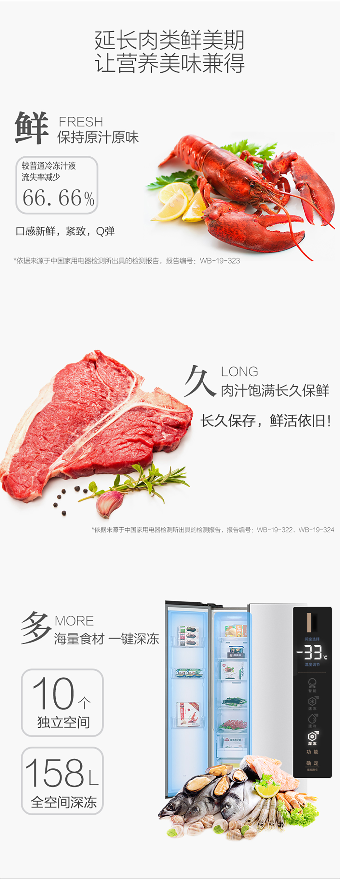 搭載-33℃深凍鎖鮮科技,肉汁飽滿更長久。采用離子長效抗菌凈味,抗菌率高達99.9%。3D沐風,風冷養鮮,無需鑿霜。